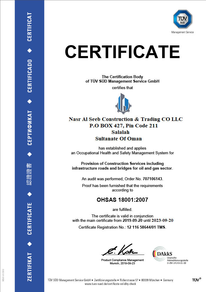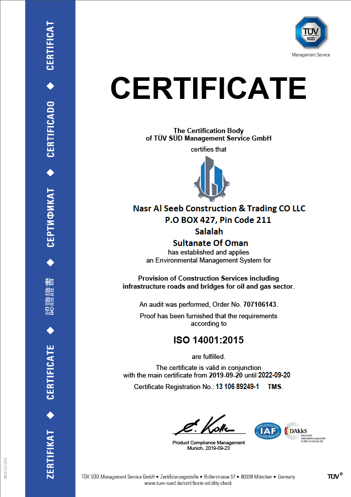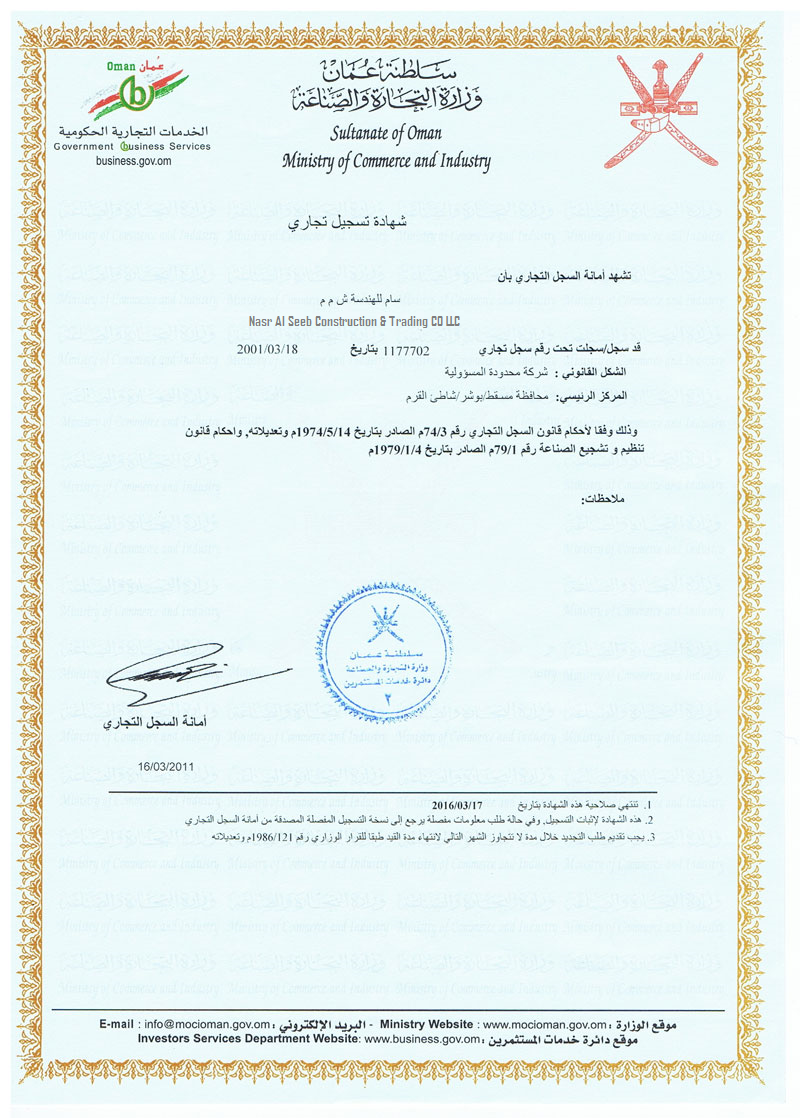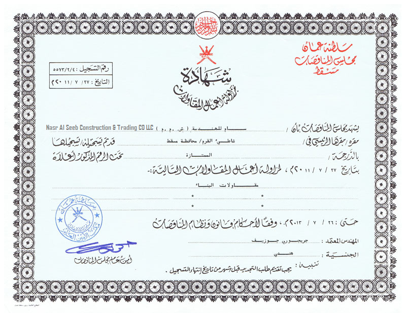 Nasr Al Seeb Construction & trading CO LLC is an ISO Certified, wholly owned Omani Company that has been in operation for over 29 years; Over the years the Company has been actively involved in the construction and development of the Country’s Infrastructure with Retail and in Mechanical machinery Tools. With operations and presence in all regions of the Sultanate and Saudi Arabia, the Company’s average annual turnover over the last five years has been OMR 2 mill. The Company is registered as an Excellent Grade Contracting Company for Civil Engineering Works. Nasr Al Seeb Construction & trading CO LLC has experience and expertise in project management.